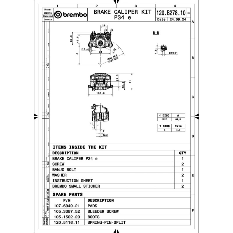 Корпус суппорта имеет два поршня диаметром 34 мм. В комплект входят тормозные колодки 07.6949.10, которые представляют лучшее из того, что в настоящее время доступно на рынке, и на корпусе нанесен лазерный логотип Brembo.