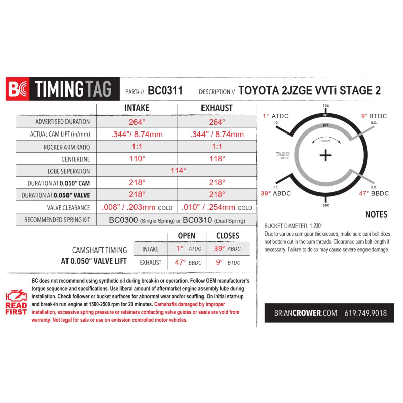 Распредвалы Brian Crower для двигателей Toyota 2JZ-GE / 2JZ-GTE VVTi, штатная установка, можно использовать стандартные пружины и тарелки.