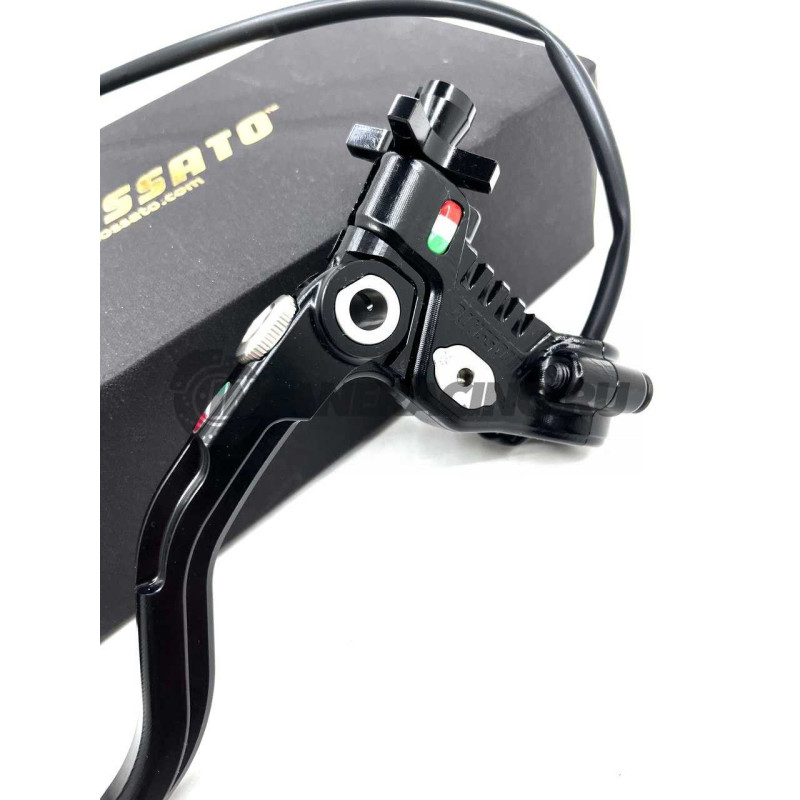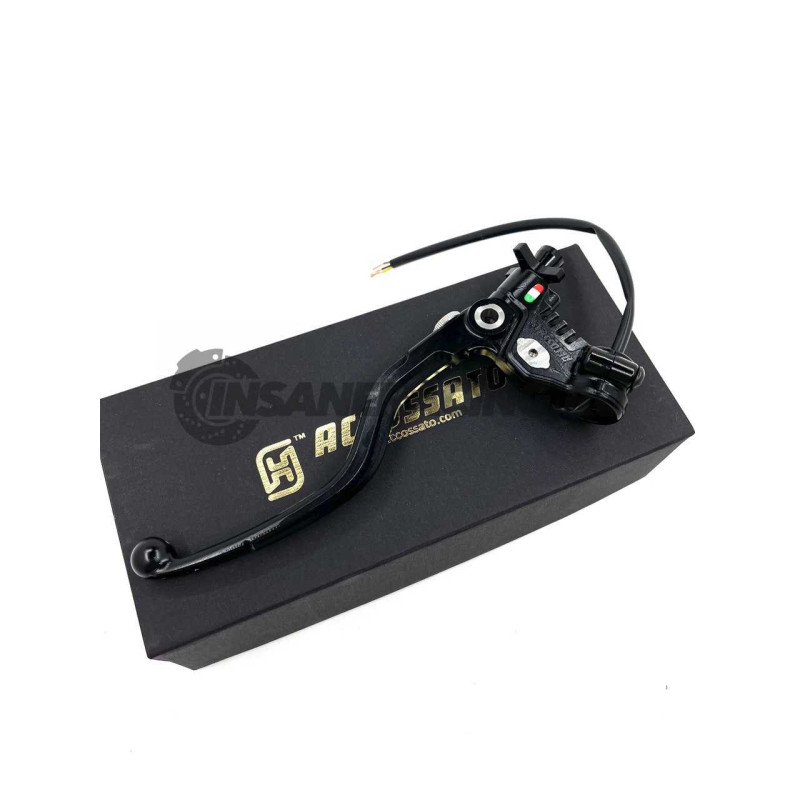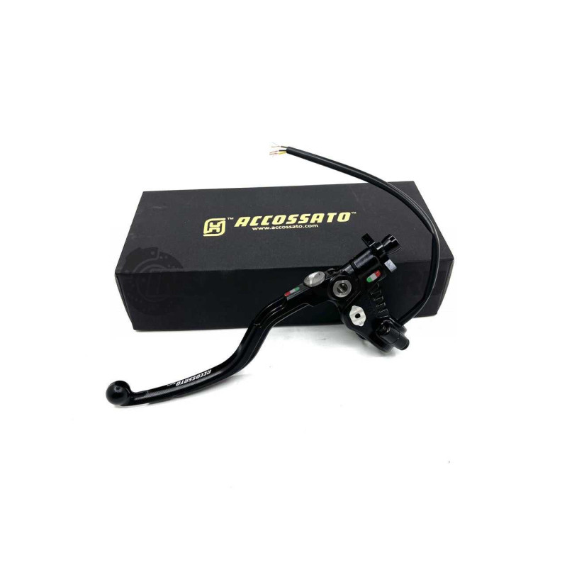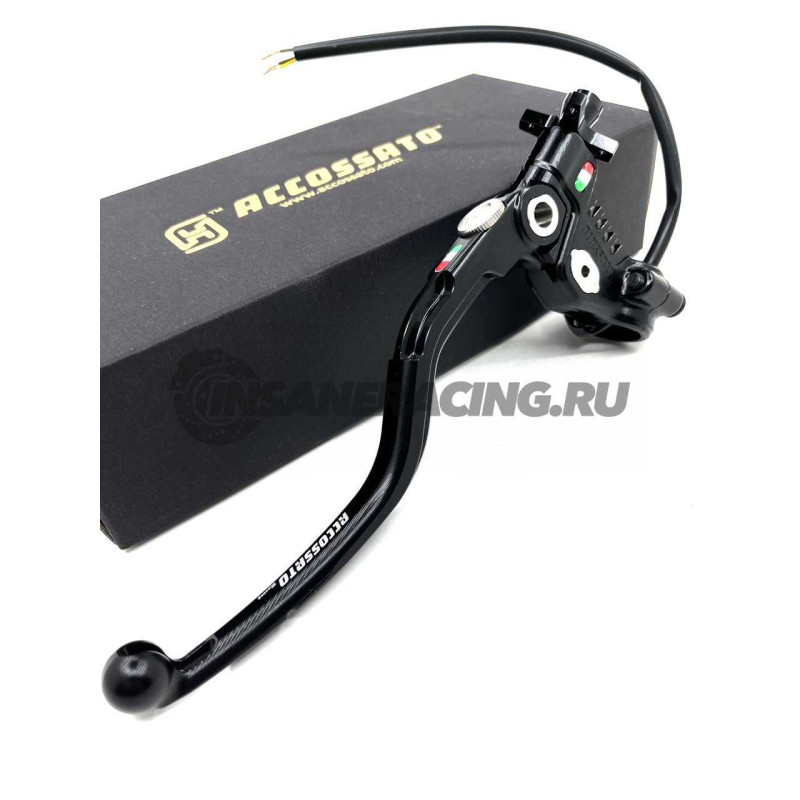 Эта новая машинка от Accossato оснащена облегченным рычагом изготовленнным из алюминия с последущим анодированием. Так же имеет регулировку растояния до руля и свою запатентованнуюрегулировку троса по щелчку. Главное отличие от предыдущих машинок что появилась возможность выбора плеча простой перестановкой эксцентрика в разные положения, тем самым вы можете выбирать из 2-ух вариантов работы машинки. Имеет микровыключатель встроенный в машинку.