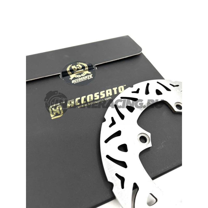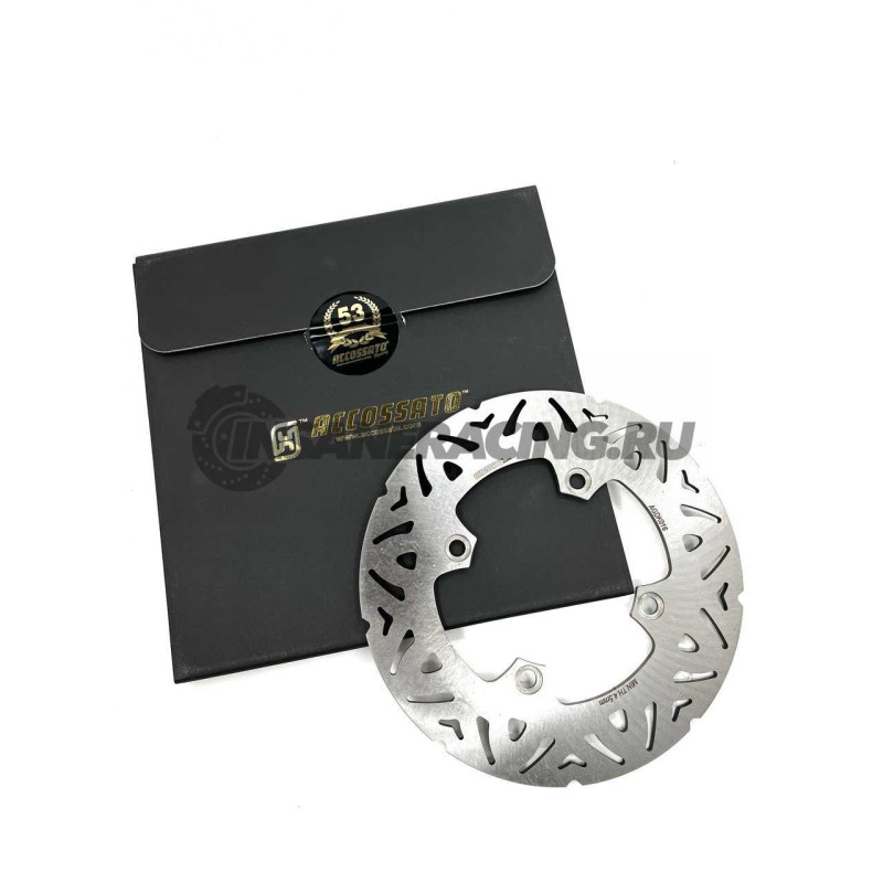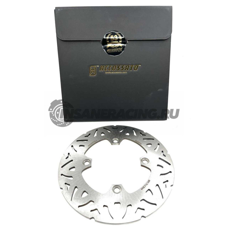 Фиксированный тормозной диск Accossato. Взаимозаменяем с оригинальным диском. Внешний диаметр: 220 мм. Внутренний диаметр: 105 мм. Толщина: 5 мм. Опыт Accossato Racing в области тормозных дисков основан на соревнованиях Superbike, Moto 2 и Moto 3. Их особая конструкция и тщательный подбор сырья позволяют тормозным дискам Accossato Racing создавать высокоэффективное тормозное усилие. Их малый вес представляет собой еще одно большое преимущество с точки зрения рулевого управления и управления мотоциклом. На дисках Accossato написана минимальная рабочая толщина диска, ведь изношенный тормозной диск при экстремальных нагрузках может сломаться. Поэтому наиболее верным решением будет замена тормозных дисков каждые 30-40 тысяч километров или даже тогда, когда диск изношен, имеет царапины, трещины или тормозная полоса не достигает защитной толщины.