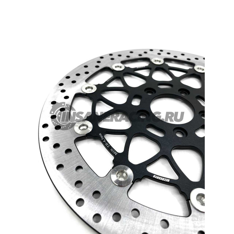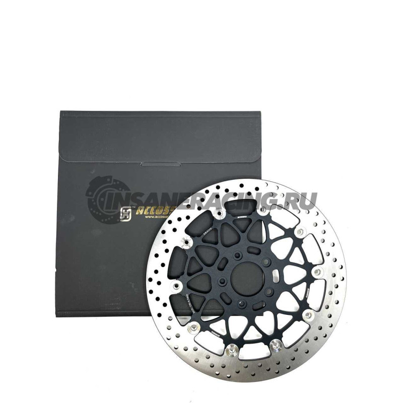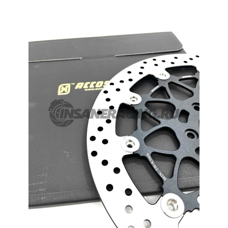 Плавающий тормозной диск Accossato Racing. Диски Accossato racing родились из опыта, накопленного в спортивных соревнованиях superbike, moto 2 и moto 3. Специальная конструкция дисков и используемые материалы позволяют эффективно передавать тормозное усилие, благодаря тщательному изучению допусков и зазора между центральной частью и ротором. Небольшой вес диска дает большое преимущество в управляемости и управлении мотоциклом. На сопряженных дисках указывается минимальная рабочая толщина диска, так как изношенный тормозной диск может сломаться в случае экстремальных нагрузок: рекомендуется заменять тормозные диски каждые 30/40 тысяч километров или когда диск изношен, имеет царапины, бороздки или тормозная полоса опускается ниже безопасной толщины.
