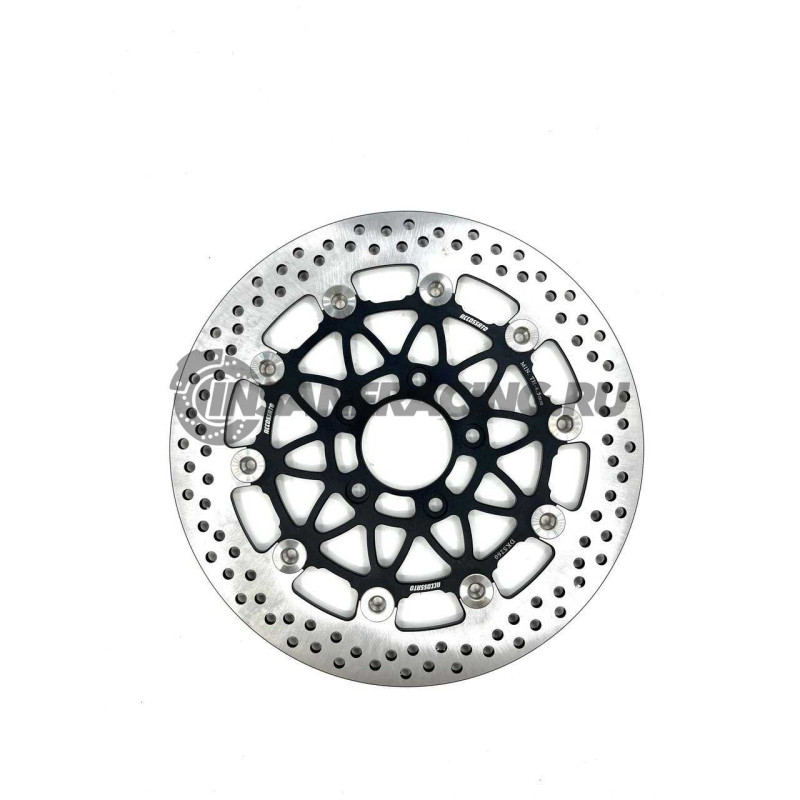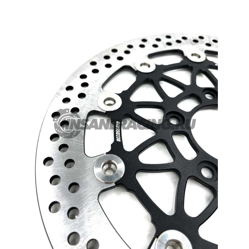 Плавающий тормозной диск Accossato Racing. Диск является взаимозаменяемым с оригинальным OEM диском. Диски Accossato racing родились из опыта, накопленного в спортивных соревнованиях superbike, moto 2 и moto 3. Специальная конструкция дисков и используемые материалы позволяют эффективно передавать тормозное усилие, благодаря тщательному изучению допусков и зазора между центральной частью и ротором. Небольшой вес диска дает большое преимущество в управляемости и управлении мотоциклом. На сопряженных дисках указывается минимальная рабочая толщина диска, так как изношенный тормозной диск может сломаться в случае экстремальных нагрузок: рекомендуется заменять тормозные диски каждые 30/40 тысяч километров или когда диск изношен, имеет царапины, бороздки или тормозная полоса опускается ниже безопасной толщины.