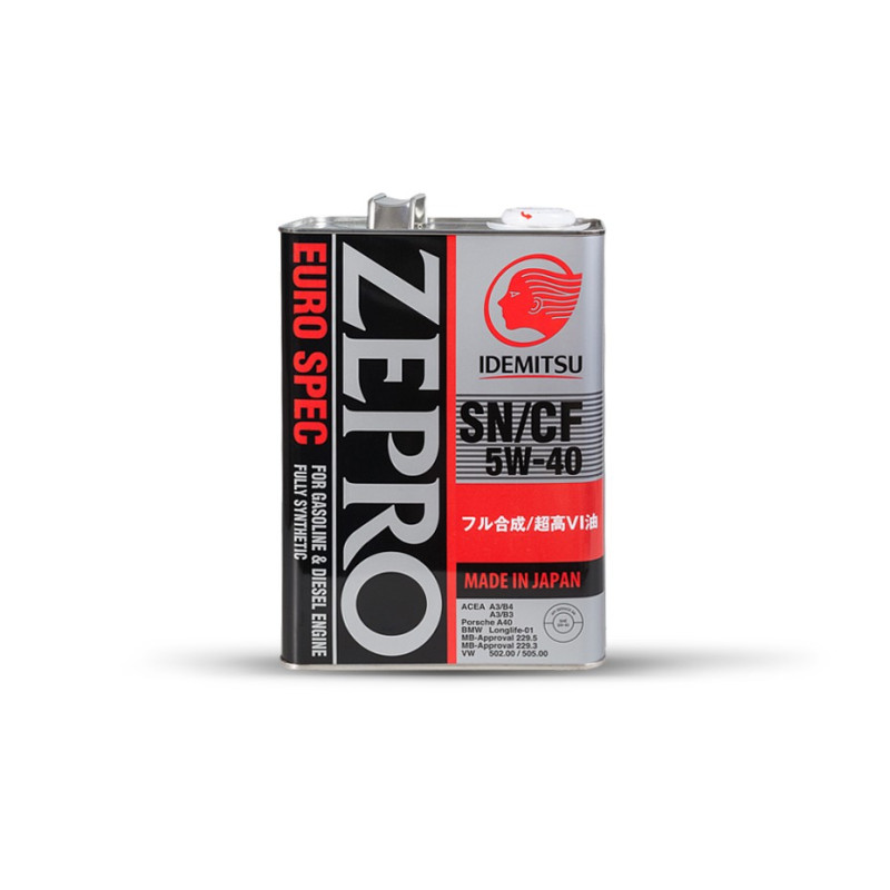 Высококачественное синтетическое моторное масло для четырехтактных форсированных бензиновых и дизельных двигателей легковых автомобилей, микроавтобусов, внедорожников, в том числе с турбонаддувом. Idemitsu Zepro EURO SPEC SN/CF 5W-40 произведен на основе синтетического базового масла с использованием запатентованной технологии Idemitsu Kosan Co., Ltd. Данный продукт обладает высокими моющими свойствами, превосходными смазывающими характеристиками при высоких температурах и малым сопротивлением к проворачиванию коленчатого вала двигателя, в условиях низкотемпературного пуска. Idemitsu Zepro EURO SPEC SN/CF 5W-40 обеспечивает надёжную защиту современных двигателей и значительно продлевает ресурс каталитического нейтрализатора и сажевого фильтра легковых автомобилей, микроавтобусов и внедорожников.