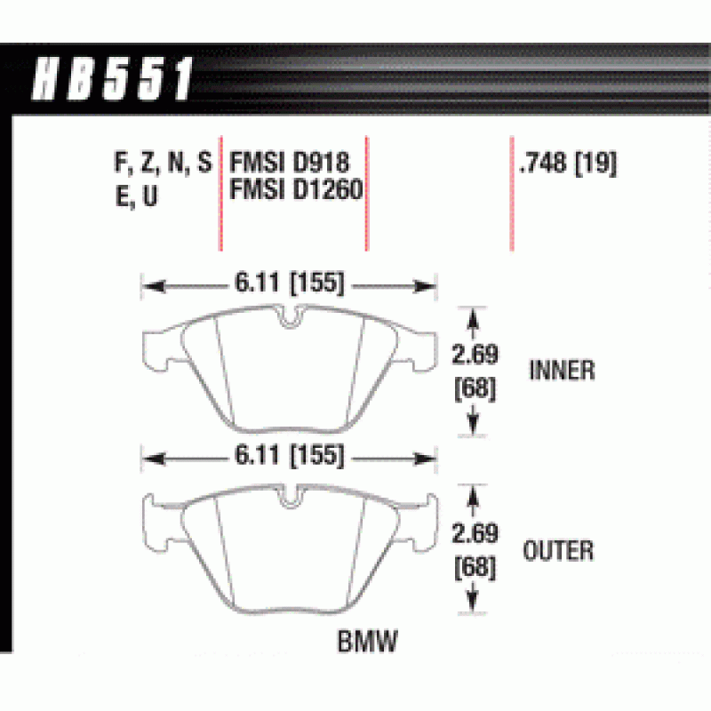Колодки тормозные HB551R.748 HAWK Street Race передние BMW 3 (E90,91,92) 335i, M3 E90, 5 E60, 6 E63
