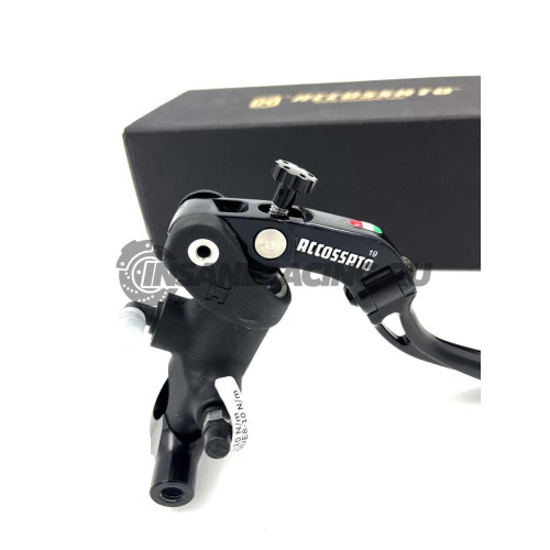 Радиальный главный тормозной цилиндр Accossato изготовлен из кованого алюминия с черным анодированием. Диаметр поршня 19 мм: подходит для двухдисковой системы. Рычаг доступен в 7 цветах, складной, короткий или длинный, с проушиной (RST) или без (NRST). Регулировочная ручка того же цвета, что и рычаг. Главный радиальный тормозной цилиндр полностью произведен в Италии; винты изготовлены из нержавеющей стали, выпускной клапан - из оцинкованной стали, а уплотнения - из компаунда формулы 1. Имеет смещенный крепеж, чтобы уменьшить изгиб главного цилиндра при торможении. Каждый компонент спроектирован так, чтобы гарантировать кратчайший пассивный ход: при нажатии на рычаг расстояние между активацией рычага и фактическим торможением сокращается более чем на 50% по сравнению с любым другим радиальным главным цилиндром.